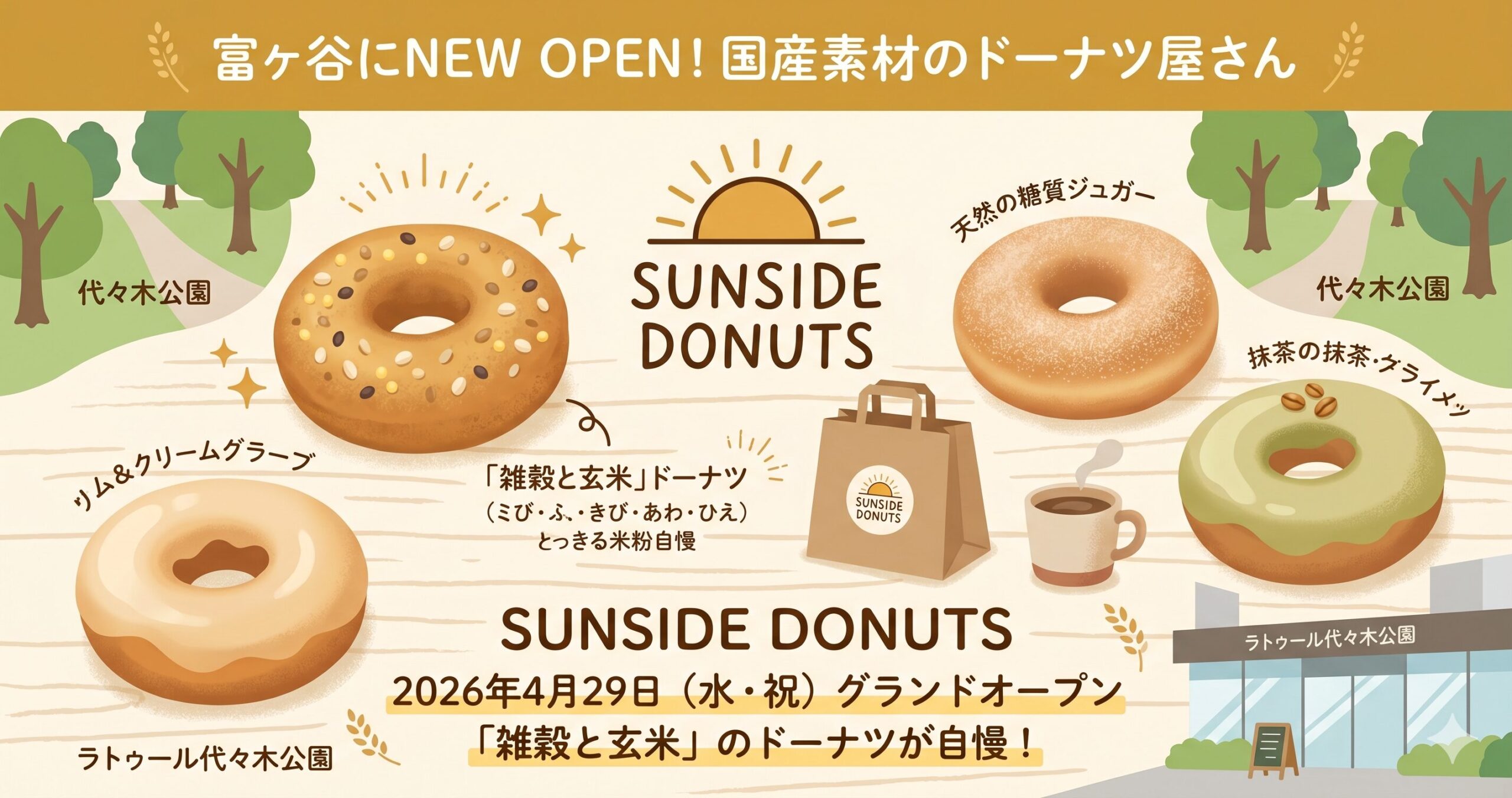 🍩 【東京・代々木公園】4/29(水)オープン!国産素材の恵みを丸ごと味わう「SUNSIDE DONUTS」