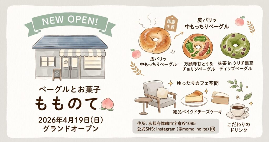 🥯 【京都・舞鶴】4/19グランドオープン!国産小麦×天然酵母の絶品ベーグルカフェ「もものて」