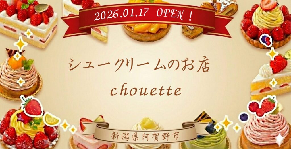 新潟県阿賀野市 国道49号線からもほど近い「姥ヶ橋」エリアに、スイーツ好きが注目する「シュークリーム専門店」が誕生しました! お店の名前は「シュークリームのお店 chouette(シュエット)」 2026年1月17日(土)にグランドオープン。 阿賀野市産の素... -